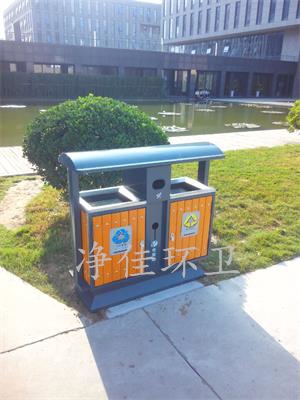 戶外鋼木分類垃圾桶,外形尺寸:1040/400/1000mm,整體板材采用實際厚度1.0鍍鋅鋼板制作而成,兩側立柱為1.5厚鍍鋅鋼管,外表做高溫噴塑處理使其外表色澤鮮艷美觀、防腐蝕" />